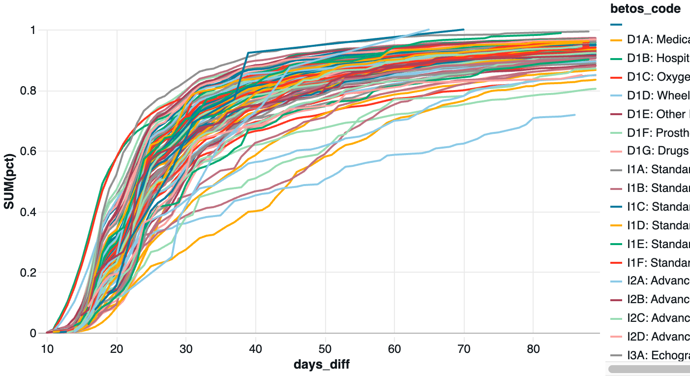 The chart below demonstrates this variation across BETOS categories. A telehealth visit might be coded and submitted within days, while a complex surgical procedure involving multiple specialists could take months to generate its final claim.