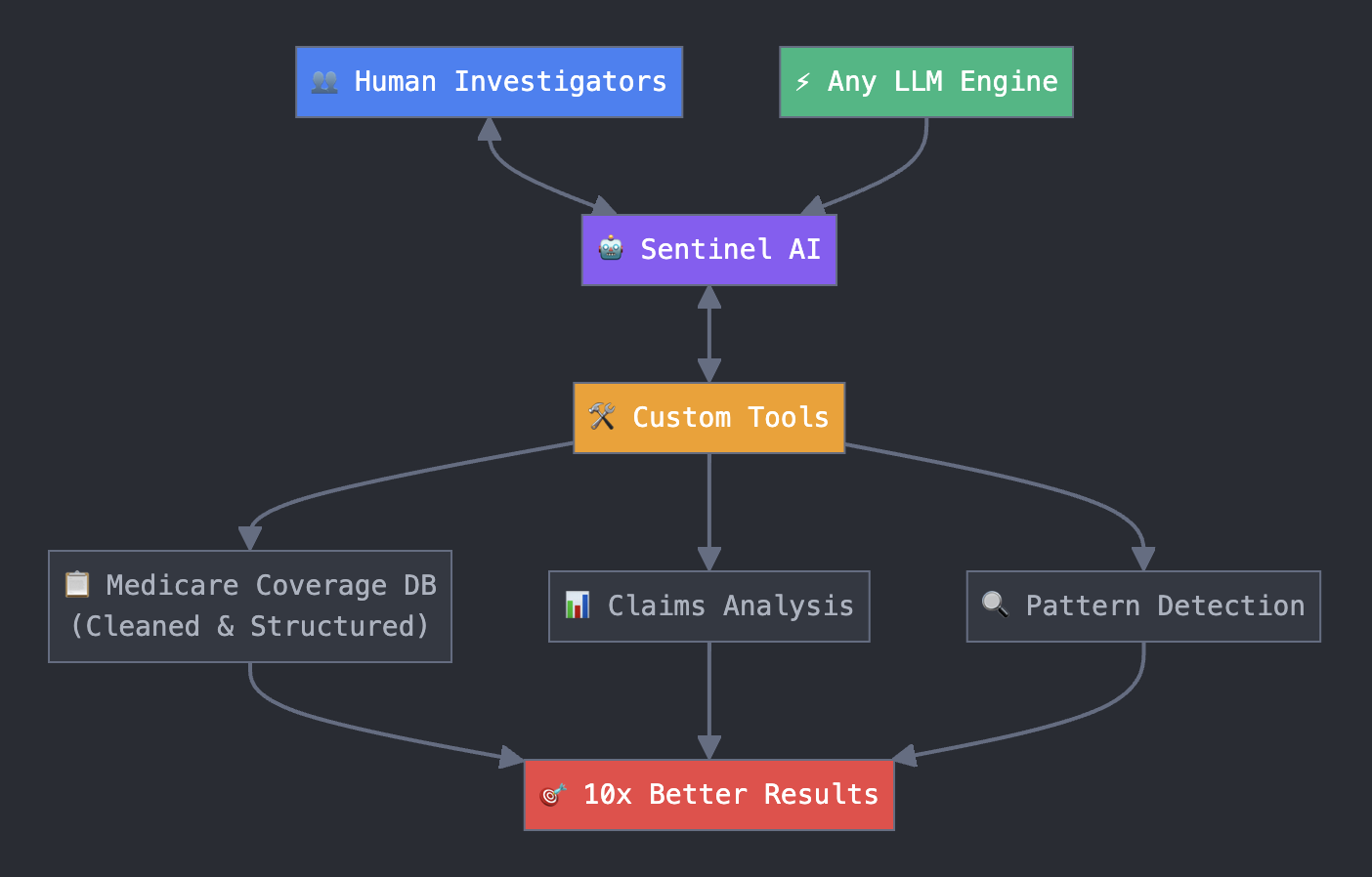 Our fraud, waste, and abuse (FWA) detection product, Sentinel, employs an AI investigator that works alongside human experts to generate new research angles, test theories against client data, analyze publicly available datasets, and explore complex data mappings. But as we refined our applications and tested against real-world scenarios, we discovered a critical gap: the AI needed specialized tools to effectively investigate healthcare fraud.
