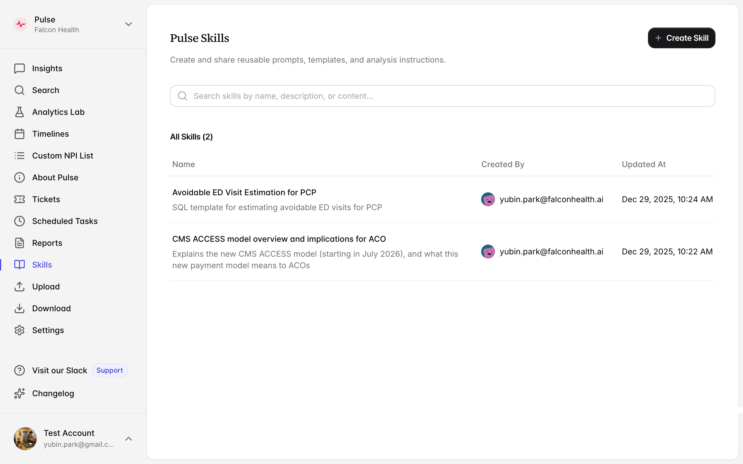 Skills are collaborative. Once you create a skill that works well for your organization, you can share it with colleagues. Your compliance team's FWA detection logic, your finance team's reporting templates, your clinical team's quality measure calculations—all can become shareable skills.