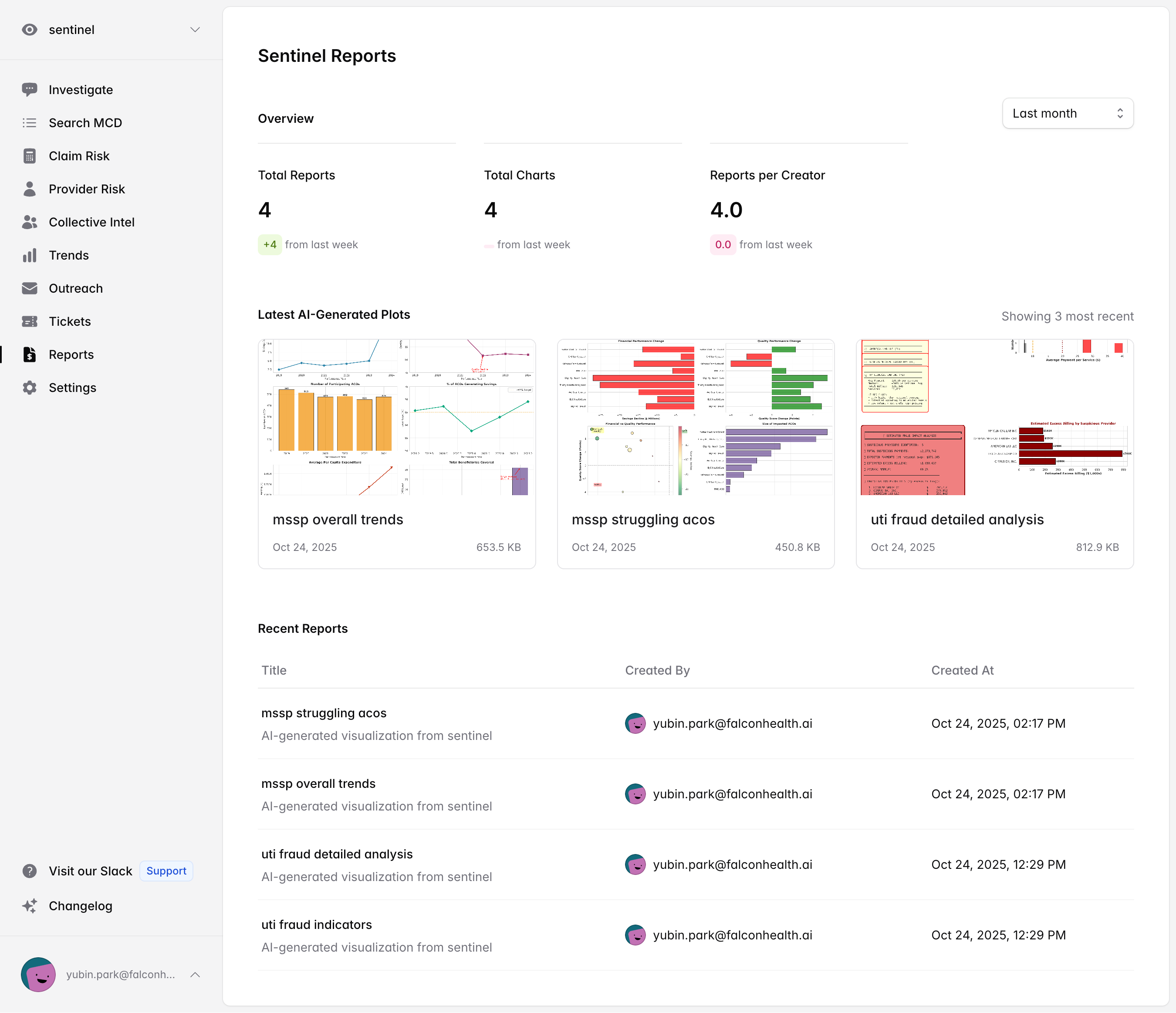 The updated Reports page serves as your personal analytics gallery. Every chart generated by Pulse Insights or Sentinel Investigator is automatically saved here, displaying your latest visualizations with a summary of total charts created. Each visualization includes the context of your original question and can be instantly shared with colleagues.