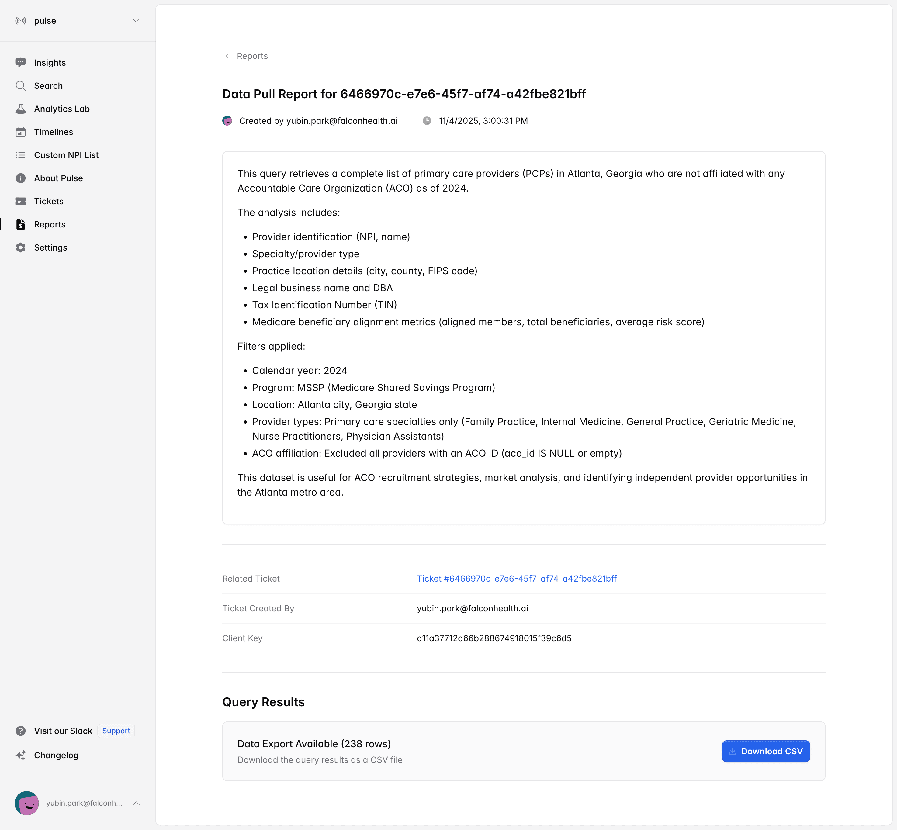 Example: A comprehensive report of Atlanta PCPs not affiliated with ACOs, automatically generated and ready to download as CSV, which contains 238 providers with complete alignment metrics, practice details, and TIN information.