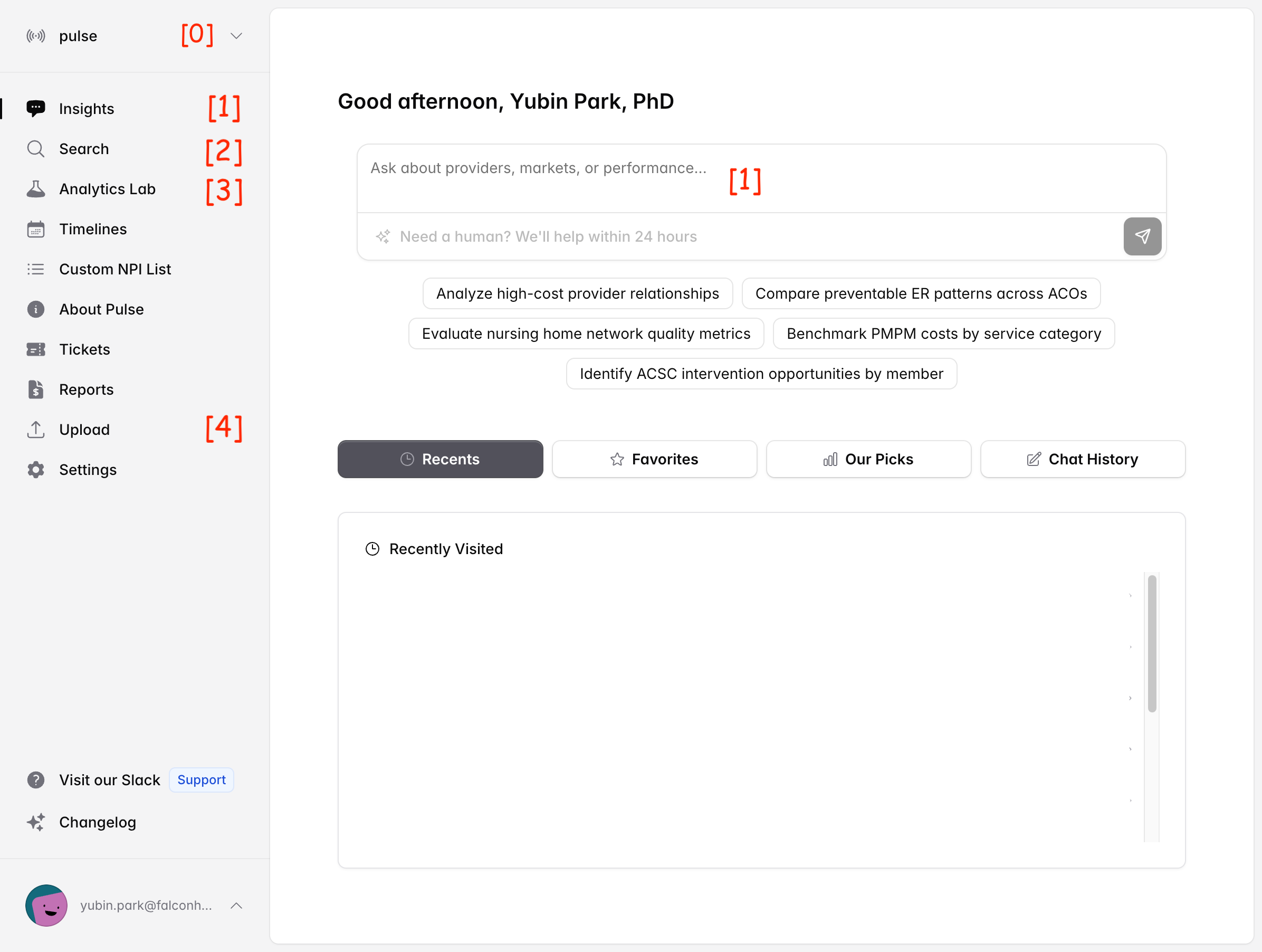 [1] Insights: Ask any questions about the market, value-based care, ACOs, or anything else on your mind. See that search bar marked [1]? Type in "Ask about providers, markets, or performance..." and get instant answers backed by our proprietary benchmark data. Think of it as your market intelligence command center.
