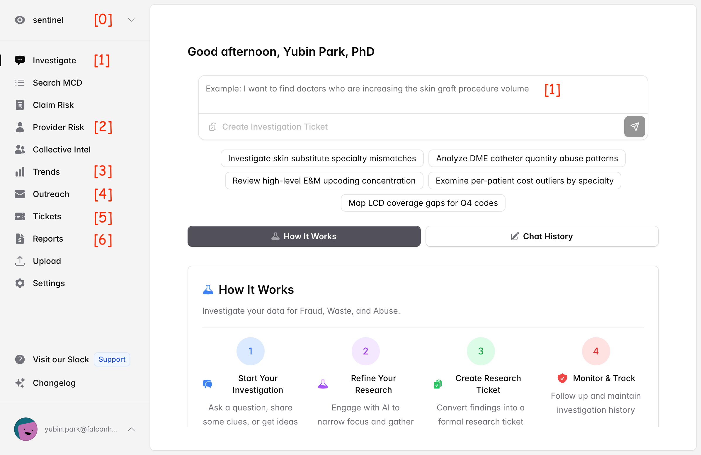 [1] Investigate: Your command center. Start here by asking questions like "I want to find doctors who are increasing the skin graft procedure volume." Sentinel listens, analyzes, and gets to work. As you chat, investigation tasks are automatically created as background jobs. These get saved as [5] Tickets. When your tickets are processed, they show up in [6] Reports with fun charts, data, and insights ready for you to explore.